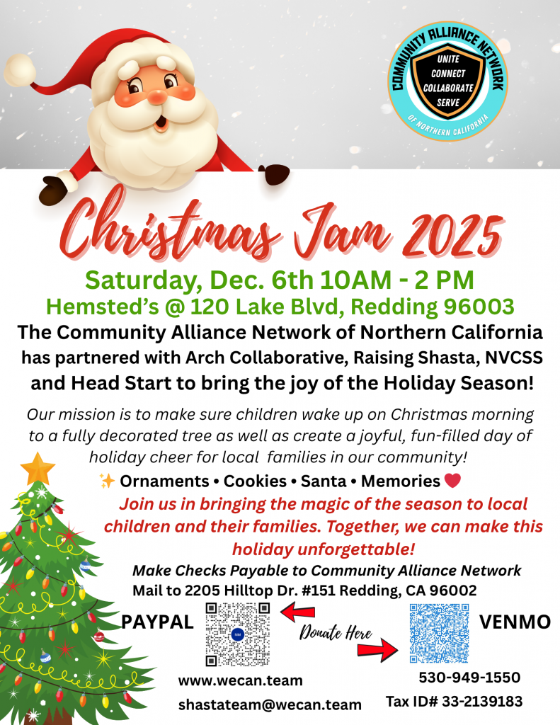 C.A.N. is thrilled to host our annual Christmas Jam, a family-friendly event spreading holiday cheer throughout the Northstate! Over the past six years, our team has provided Christmas trees, decorations, and festive activities for families in need, creating a magical experience for kids and adults alike. This year’s event featured tree pick-up, cookie decorating, and holiday photos with Santa—all made possible by the generous support of our local business sponsors.